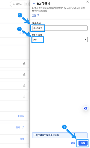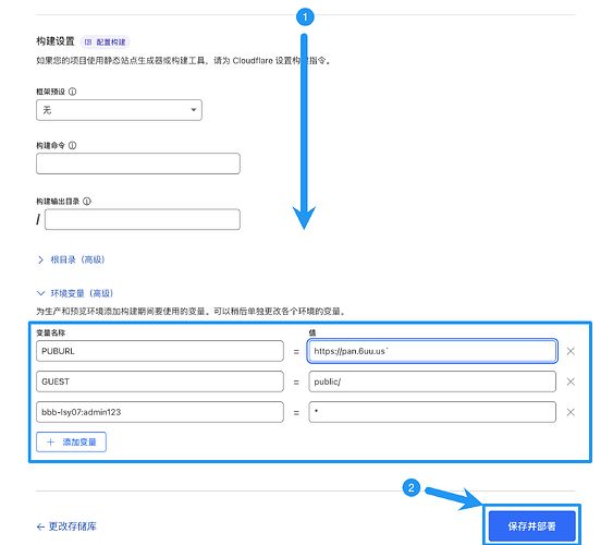 下滑添加如下变量信息,点击“保存并部署”:PUBURL-填写刚才设置储存桶自定义域名GUEST-游客允许写入的目录用户名:密码-*(注意冒号使用英文输入法
