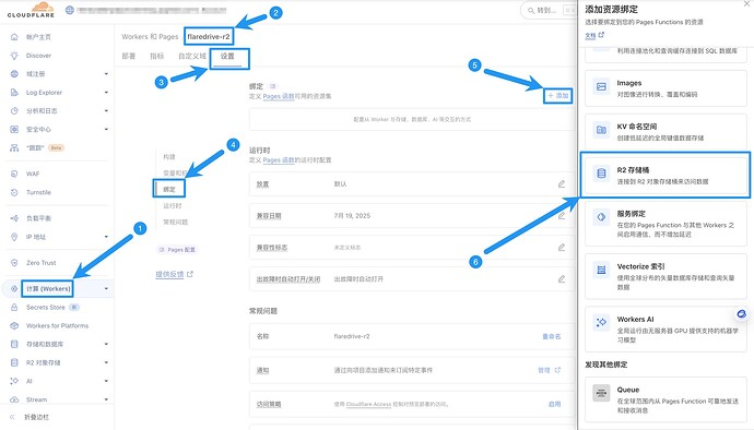 等待一些时间,就部署好了,但这时还没完。我们需要进入刚才部署的Pages项目控制板中添加绑定存储库(按照图中步骤