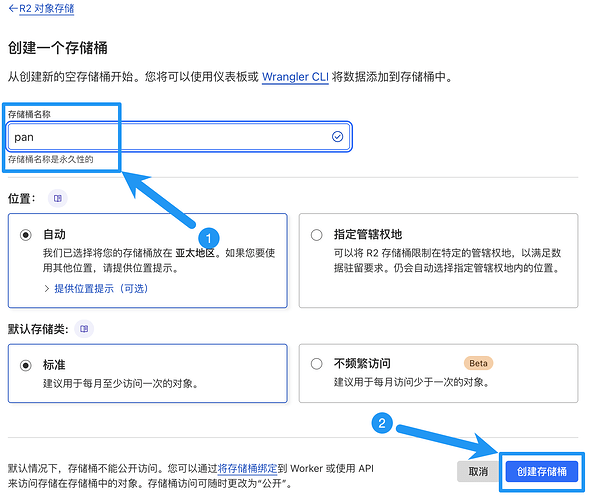 设置存储桶名,比如这里设置为“pan”,然后点击右下角“创建存储桶”