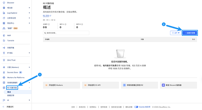 复刻之后,我们来到cf(cloudflare)进行登录,登录后在左侧找到“R2对象储存”并点击,进入“R2对象储存”页面后点击右侧的“创建存储桶”
