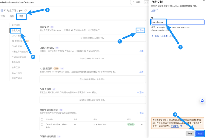 创建完成后,会自动进入管理界面,按照图中操作:点击“设置”-“自定义域”-“自定义域添加”,输入你的域名(最好是已经托管在Cloudflare的,这样会更安全、快速),会自动连接