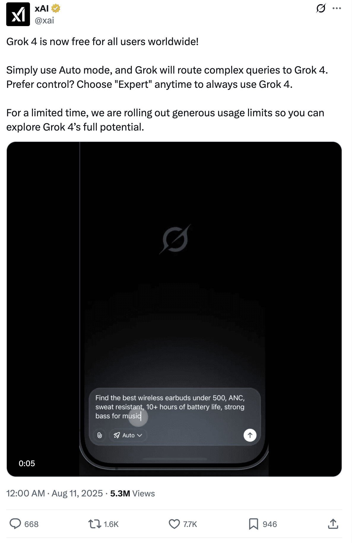 经过一系列测评,Grok-4 和 GPT-5 的画像变得愈发清晰。这场看似是技术参数的较量。Grok-4 的免费开放,无疑为广大用户提供了一个全新的、强大的选择,也让这场对决更具看点。