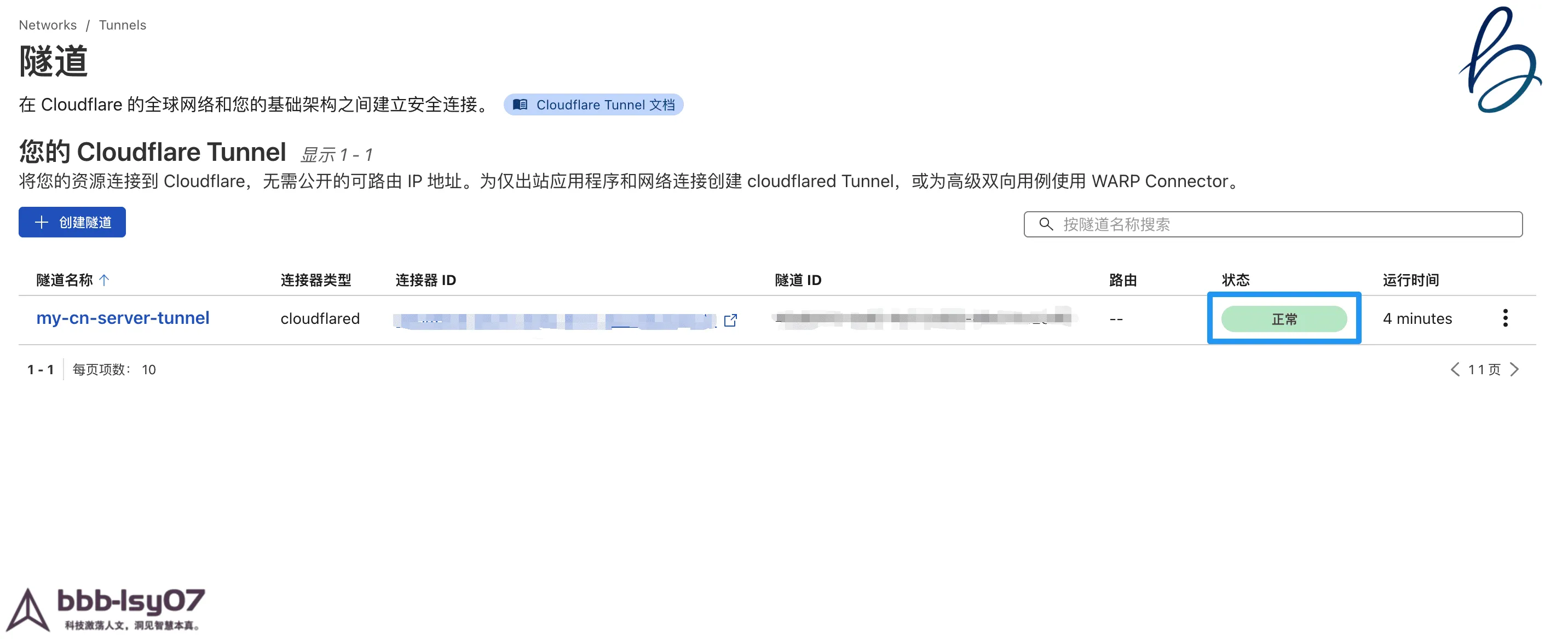 等待几分钟,Cloudflare 会自动为子域名创建 CNAME 记录(指向类似 xxxx.cfargotunnel.com)。