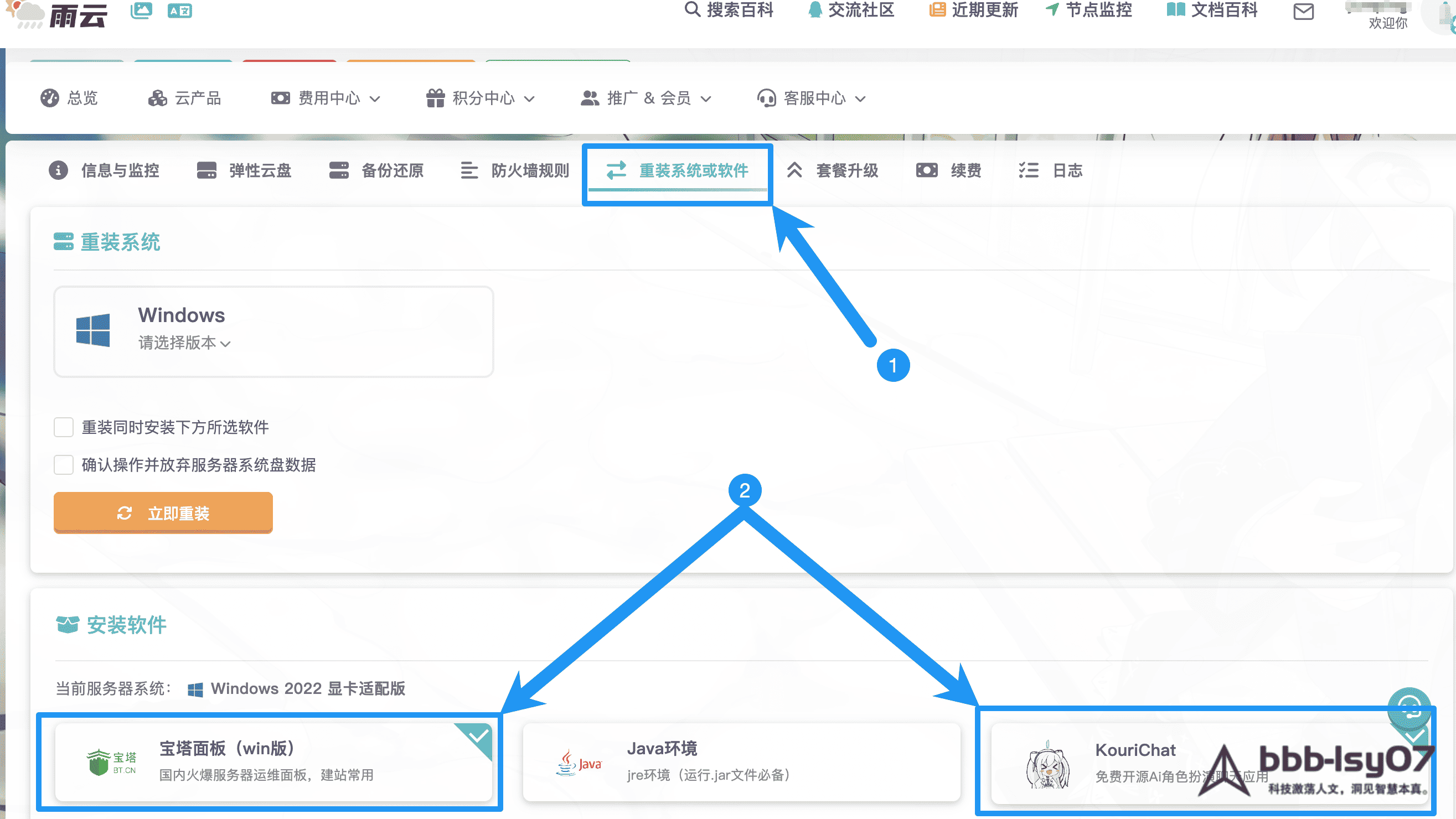 在雨云控制台找到刚买的服务器,选择“重装系统或软件”,下滑找到“安装软件”选择你需要的软件进行安装,这里选择“宝塔面板”