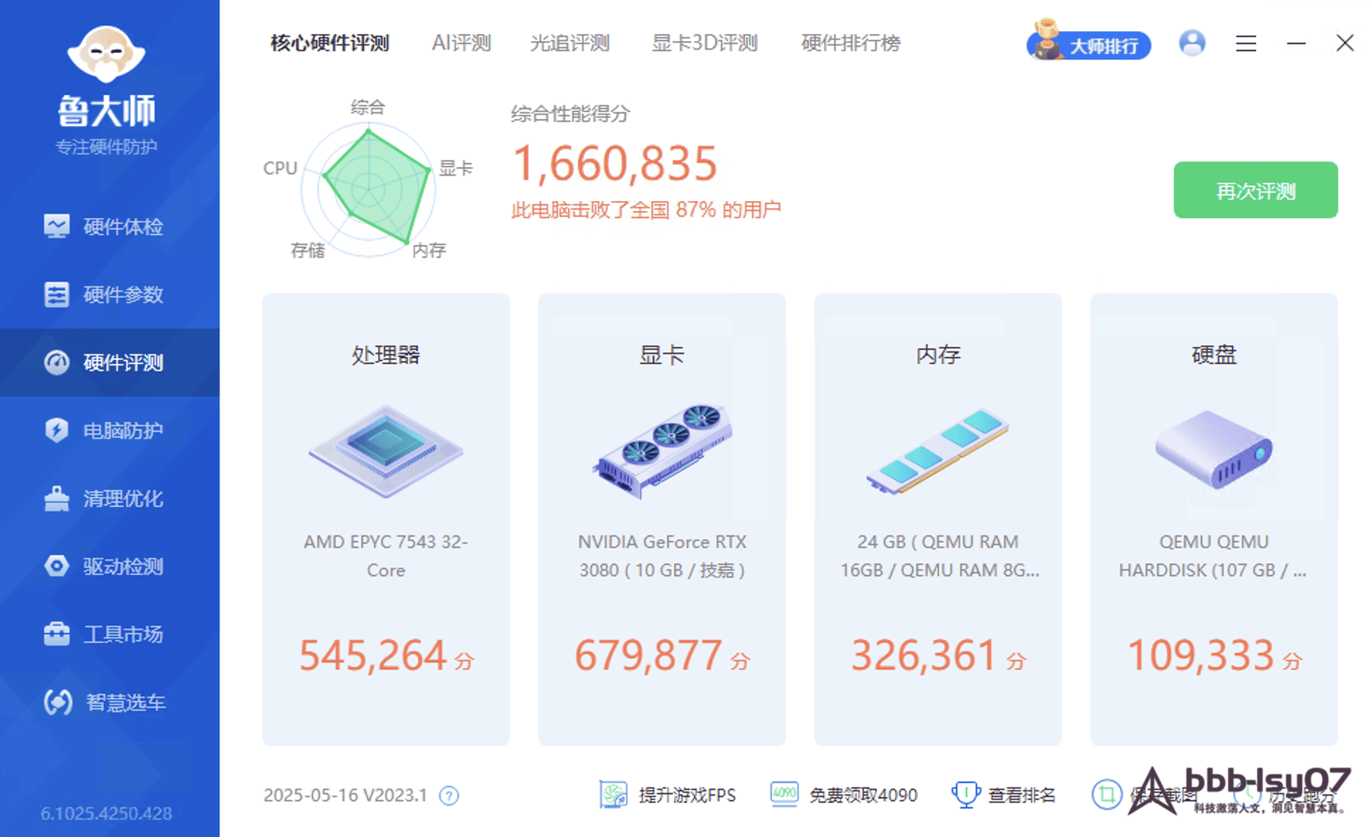 为了更快速,全面的进行测试AI和服务器性能,选择了鲁大师进行测试性能(仅供参考)